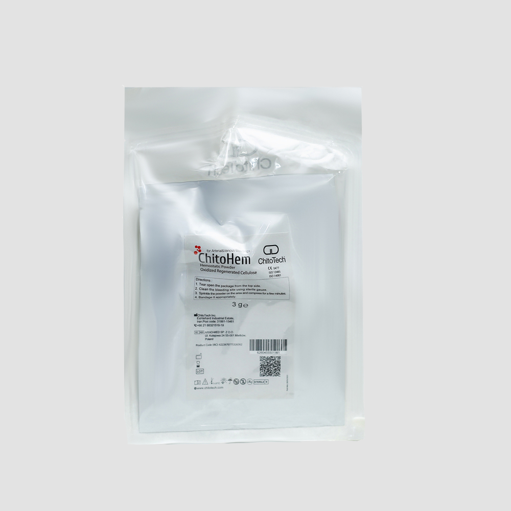 ChitoHem is an antibacterial, biocompatible hemostatic powder made of polysaccharide, oxidized regenerated cellulose, suitable for all types of bleeding including arterial, venous, capillary and oozing in surgical procedures or injuries. It prevents postoperative adhesion.